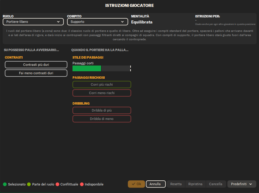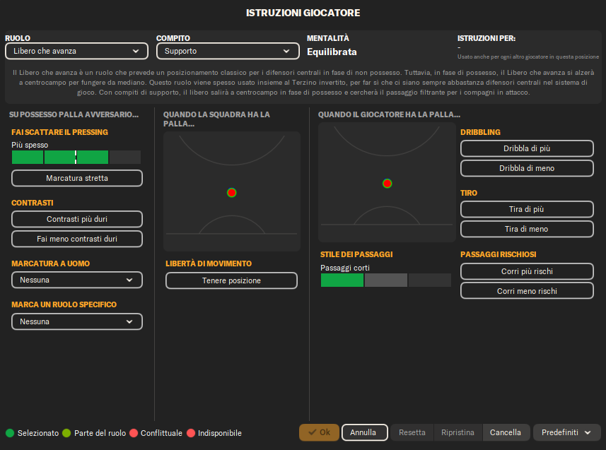 Libero (Supporto): Una figura dinamica che funge da collante tra difesa e centrocampo. Avanza quando necessario, creando superiorità numerica nella costruzione del gioco.