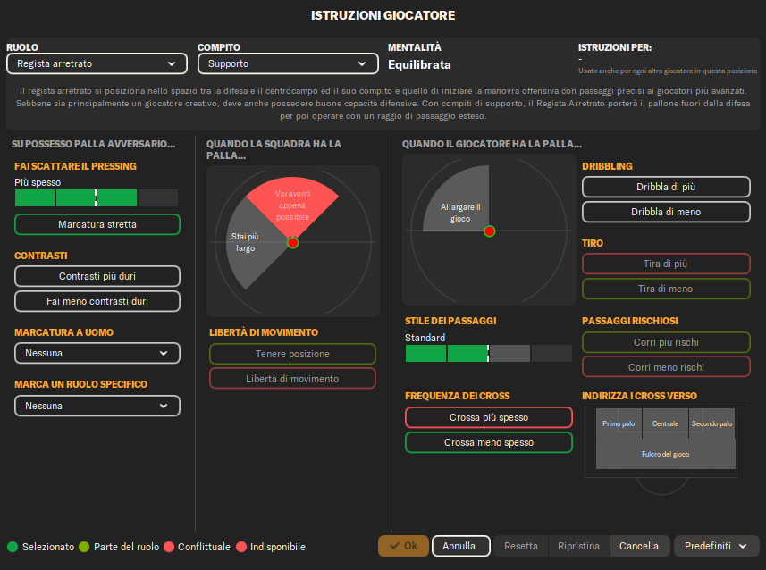 Regista Arretrato (Supporto): La mente del centrocampo, sempre pronto a dettare i tempi del gioco e smistare palloni in sicurezza o con visione strategica.