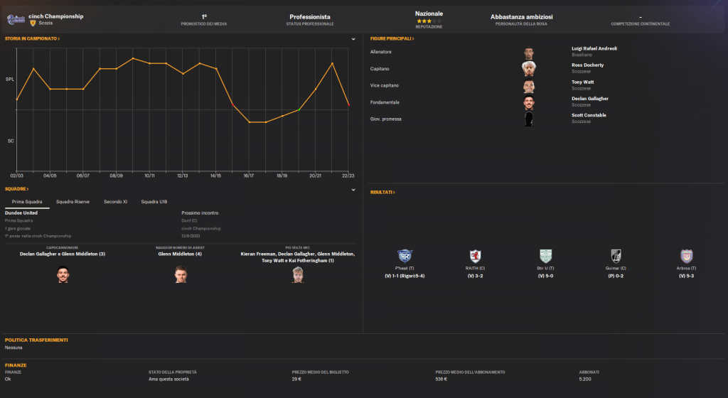 Negli ultimi anni, il Dundee United ha alternato stagioni in Premiership e Championship, cercando di ritrovare stabilità nella massima serie. Con una forte tradizione nel valorizzare giovani talenti e una tifoseria appassionata, il club punta a riconquistare un ruolo di primo piano nel calcio scozzese.